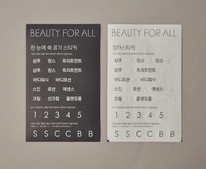 이미지 확대보기아모레퍼시픽이 이러한 점에 착안해 일상에서 매일 사용하는 화장품 및 생활용품 사용에 불편함을 줄일 수 있도록 이번 점자스티커를 기획했다. 아모레퍼시픽이 제작한 점자스티커는 화장품, 생활용품 중 스킨, 로션, 샴푸, 린스 등 주요 10가지 카테고리를 점자로 표기했다. 이 외에도 알파벳이나 숫자가 양각 처리된 기호를 포함하여 점자를 읽지 못하는 사용자도 이용에 불편함이 없도록 제작했다.