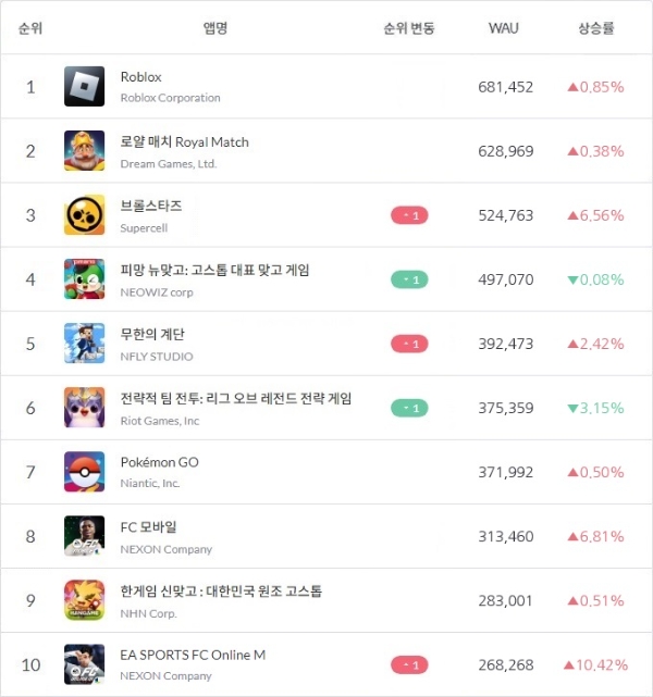 브롤스타즈 외에도 넵튠 '무한의 계단'과 넥슨 'EA 스포츠 FC 온라인' 모바일 버전이 상승세를 보였다. 전주 10위 브롤스타즈 '클래시로얄'은 WAU 25만3802명으로 11위에 자리잡았다.