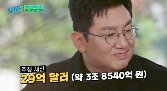 이후 MC 조세호가 "포브스가 추정하는 방시혁 의장 추정 재산(자산)이 약 29억 달러(한화 약 3조 8540억 원)이고 박진영 CCO는 약 5281억 원"이라고 말했다.