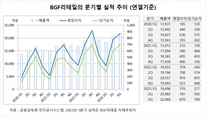 IBK투자증권은 BGF리테일의 올해 연결기준 매출액이 8조2660억원, 영업이익이 2600억원, 당기순이익이 1990억원에 달할 것으로 추정했다.