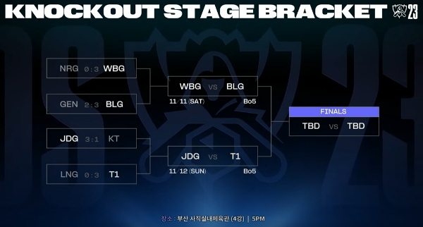 2023 LOL 월드 챔피언십 4강전은 오는 11일 WBG와 BLG의 경기로 막을 연다. T1과 징동의 경기는 12일 진행되며, 각 경기의 승자는 오는 19일 서울 고척 스카이돔에서 열릴 결승전에서 맞붙는다.