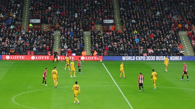 지난 5일(한국시간) 영국 셰필드의 브라몰 레인에서 열린 영국 프리미어리그 울버햄프턴과 셰필드의 경기에서 '2030 부산 엑스포 유치'를 기원하는 광고가 나오고 있다. 롯데는 이 경기를 포함해 총 11개 영국 프리미어리그 경기에 엑스포 유치 기원 광고를 선보인다. 사진=롯데 이미지 확대보기