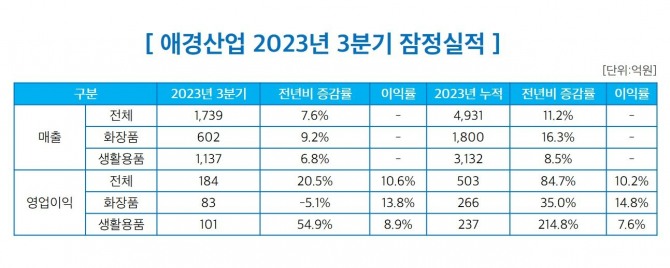 이미지 확대보기애경산업은 올 3분기 매출이 전년 동기 대비 7.6% 증가한 1739억원으로 잠정 집계됐다고 6일 밝혔다. 같은 기간 영업이익은 20.5% 증가한 184억원을 기록했다. 올해 누적 매출은 4931억원, 영업이익은 503억원을 기록해 각각 11.2%, 84.7% 증가했다.
