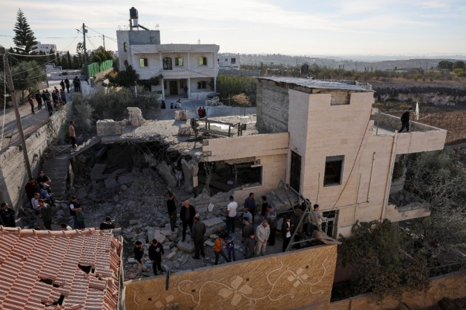 이미지 확대보기이스라엘군의 공격으로 무너진 집 잔해더미 주위에 모여 있다. 이스라엘군은 서안의 테러리스트 2명의 집을 부쉈다고 주장하고 있다. 사진=로이터