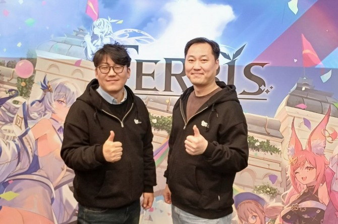 지스타 2023 '테르비스' 게임 설명회 기념 사진. 개발사 웹젠노바의 천삼 대표(왼쪽)과 윤태호 '테르비스' 총괄 프로듀서(PD). 사진=이원용 기자이미지 확대보기