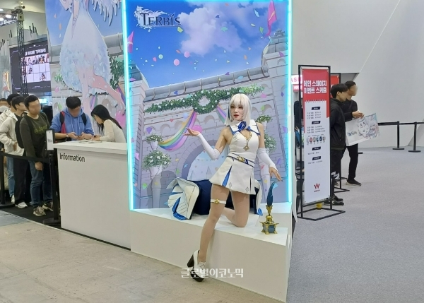 이미지 확대보기지스타 2023 웹젠 부스에서 차기작 '테르비스' 속 캐릭터로 분장한 코스프레 모델. 사진=이원용 기자