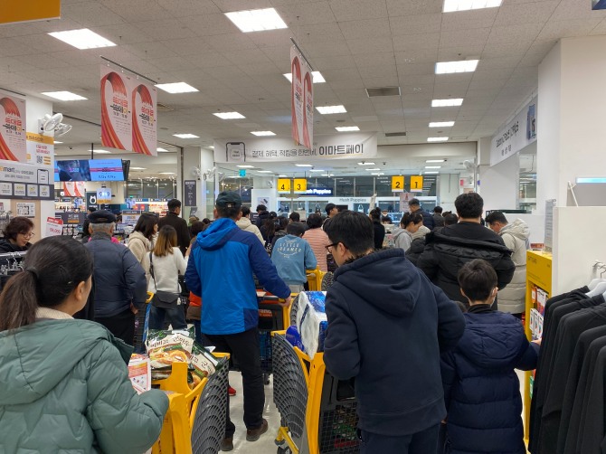 오늘(19일) 정도면 한숨 돌릴 수 있는 정도라고 말한 그의 말이 무색할 만큼 매장은 북적였다. 셀프계산대 줄은 매장 출입구에서부터 청과를 판매하는 곳까지 수십미터 가량 늘어져 있었다. 전날인 토요일에는 계산 줄이 이보다 더 길어 청과 코너를 지나 축산코너까지 이어졌다는 게 내부관계자의 전언이다.