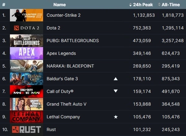 이미지 확대보기스팀 운영사 밸브 코퍼레이션의 '카운터 스트라이크 2'와 '도타 2', 크래프톤의 '펍지: 배틀그라운드' 등 스팀 이용자 수 톱5 게임 간 순위 변동은 없었다.