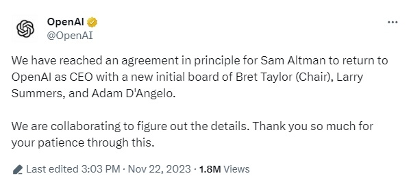 오픈AI는 22일 공식 X(트위터) 등 소셜 미디어를 통해 "당사는 샘 올트먼 대표이사와 브렛 테일러 의장, 래리 서머스, 아담 디안젤로 등으로 구성된 이사회가 오픈AI로 복귀하는 것에 합의했다"며 "세부 사항은 협의를 통해 결정할 것"이라고 발표했다.