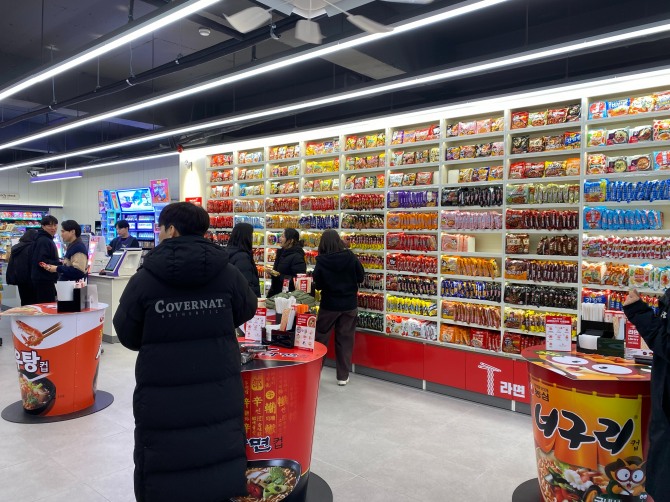 매장 한쪽 벽면은 통으로 라면 진열에 할애했다. 마치 유럽 대형 서점의 책장 앞에선 듯한 기분이 들 만큼 편의점에서는 좀처럼 보기 힘든 압도적 규모를 자랑했다. CU에 따르면 이 진열장은 가로 6m, 세로 2.5m에 달하는 100칸짜리 초대형 사이즈로 각 칸마다 K-라면 90여종, 해외라면 15종 등 총 105종의 라면이 질서정연하게 줄 맞춰져 있었다. 형형색색 빈틈없이 채워진 라면 진열장 앞은 인증샷 스폿으로서의 역할도 해내고 있었다.
