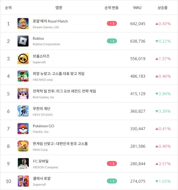 이미지 확대보기넥슨 'EA 스포츠 FC 모바일'과 슈퍼셀 '클래시 로얄'이 9위 자리를 두고 순위 다툼을 벌이고 있다. 11위는 WAU 23만607명을 기록한 플레이릭스 '꿈의 정원', 12위는 23만454명의 'EA 스포츠 FC 온라인 M'이었다.