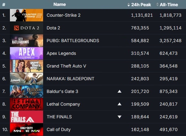 국산 게임 중 '배틀그라운드', '더 파이널스', '데이브 더 다이버' 외에도 스마일게이트 '로스트아크(6만1233명)'가 21위, 위메이드 '미르4(2만6525명)'가 61위, 펄어비스 '검은사막(2만5392명)'이 64위, 님블뉴런 '이터널 리턴(1만2635명)'이 126위를 차지했다.