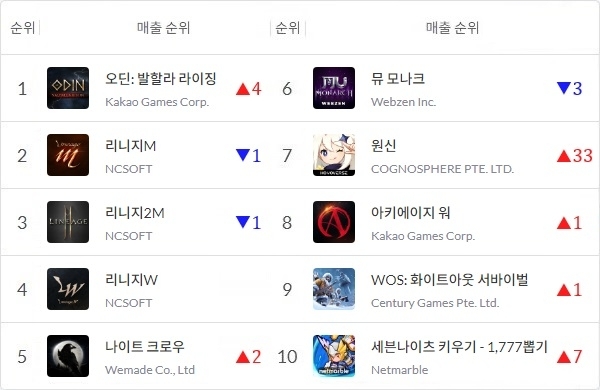앱 통계 분석 플랫폼 모바일인덱스에 따르면 업데이트 이전 8위에 머무르던 오딘은 21일 오후 9시를 기점으로 매출 2위에 올랐다. 이어 23일 오후 3시, 엔씨소프트(NC)의 '리니지M'을 제치고 1위에 올라섰다.