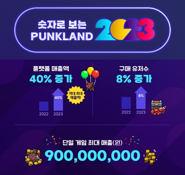 펑크랜드 내 게임들이 올해 실행된 횟수는 8400만회, 누적 플레이 타임은 286억초(약 33만일)이었다. 총 49만5770개 신규 캐릭터가 생성됐으며 아이템은 약 120만회 거래됐다.