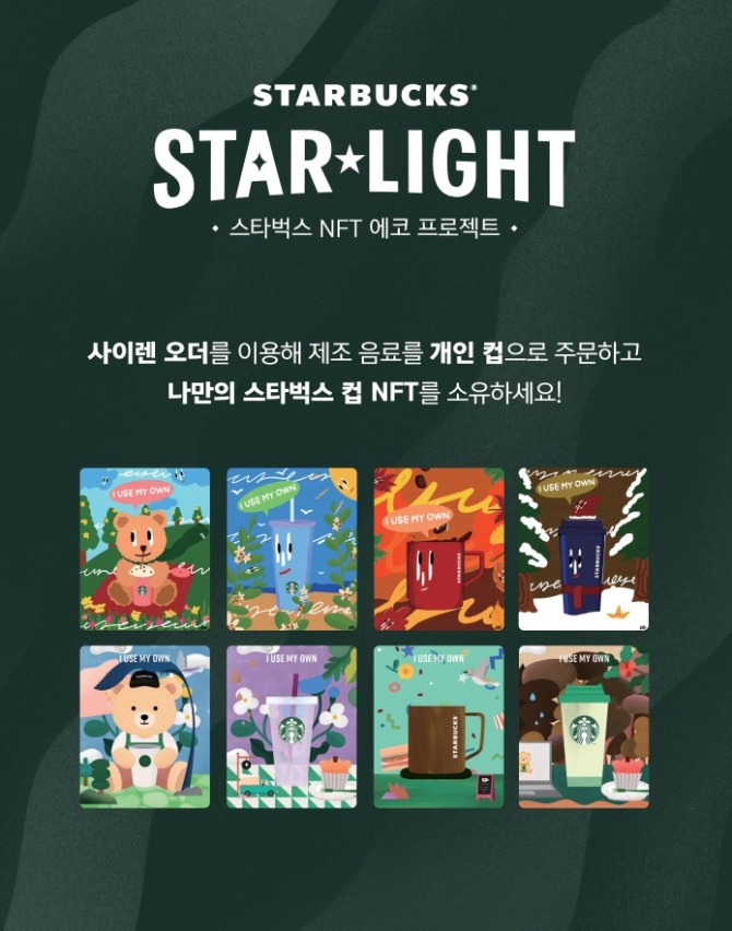 이미지 확대보기스타벅스는 오는 16일부터 스타벅스 리워드 고객이 사이렌 오더로 제조 음료 주문 시 개인 컵을 이용하면 영수증당 에코 스탬프를 한 개씩 적립해주고, 에코 스탬프 적립 미션 달성 시 스타벅스 NFT를 제공하는 ‘STARBUCKS STAR★LIGHT’를 시작한다.