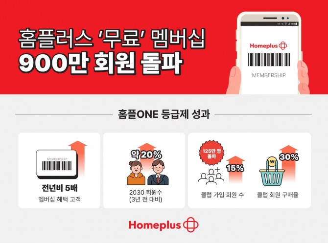 마이홈플러스 멤버십 회원이 900만을 돌파함에 따라 ‘홈플 ONE 등급제’ 혜택을 받은 고객 수는 지난해 오프라인 등급제 대비 5배 이상 늘어난 것으로 나타났다. 2030 멤버십 회원 수도 3년 전보다 약 20% 늘었다.