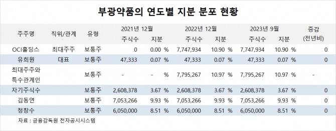 이미지 확대보기부광약품은 지난 2020년 3월 최대주주와 특수관계인이 보유하고 있는 주식 약 773만주(지분 약 11%)를 OCI에게 1461억원에 매각하는 주식 매매 계약을 체결했다. 그 후 OCI는 2022년 3월 부광약품 지분 약 11%를 보유하게 돼 최대주주 지위를 확보했다.