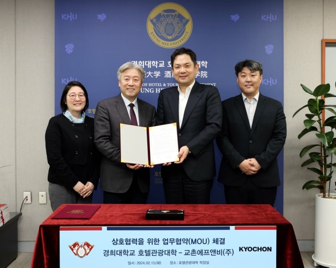 이날 협약식에는 경희대학교 호텔관광대학 정남호 학장과 조리&푸드디자인학과 정라나 학과장, 교촌에프앤비㈜ 윤진호 대표이사와 방문성 R&D센터장, 박호정 상품기획팀장 등이 참석했다.