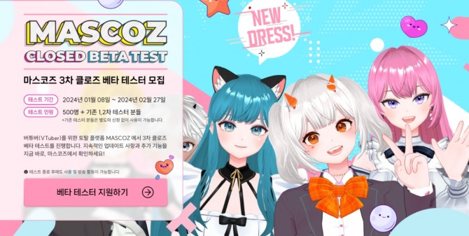 현재 마스코즈는 3차 클로즈 베타 테스터 모집을 진행 중이다. 오는 27일까지 진행되는 클로즈 베타 테스트는 기존 1, 2차 테스터와 함께 추가로 500명의 인원을 모집하며 테스트 종료 후에도 캐릭터 사용과 방송 활동이 가능하다. 이에 직접 '버추얼 캐릭터'를 제작하고 방송을 위한 페이스 트래킹까지 경험해봤다.