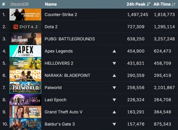구체적으로 소니 인터랙티브 엔터테인먼트의 2월 8일 신작 '헬 다이버스 2'가 5위, 일본 인디 게임사 포켓 페어에서 1월 9일 선보인 '팰월드'가 7위, 미국 인디 게임사 일렌브스 아워 게임즈가 2월 22일 정식 서비스를 개시한 '라스트 에포크'가 8위를 차지했다.
