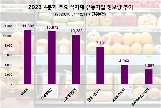 4위 이하 기업의 정보량은 1만 건 미만으로 분석됐다. 현대백화점그룹의 현대그린푸드는 7791건의 포스팅 수로 4위에 랭크됐다. 삼성그룹의 삼성웰스토리는 지난해 4분기 4,043건의 정보량으로 5위를 지켰다.
