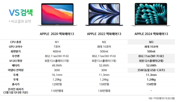 다나와 측은 두 맥북에어 모델과 2022년 M2 칩셋 탑재 모델을 포함 3개의 맥북 에어 13인치, 256GB 저장 공간 버전을 비교한 결과를 발표했다. 이에 따르면 칩셋 변경 외에도 △미디어 엔진 △와이파이 6에서 와이파이6E 규격으로 전환 △외장 디스플레이 1대→2대로 증가 △35W 듀얼 충전 어댑터 도입 등 5개 부문에 차이가 있었다.