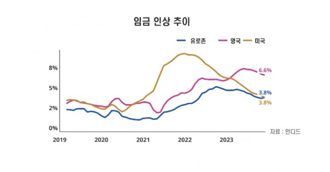 미국, 영국, 유로존의 임금 인상 추이. 미국의 둔화 추세가 두드러진다. 사진=인디드이미지 확대보기