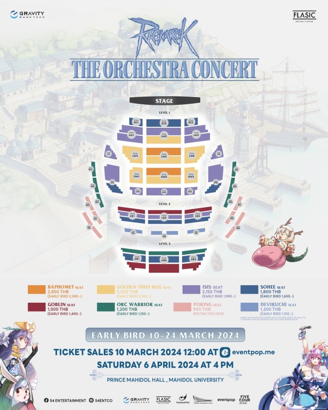 이번 태국 지역 라그나로크 디 오케스트라 콘서트 티켓은 이벤트팝(eventpop) 페이지에서 예매할 수 있다. 관람객에게는 공연 당일 현장에서 티켓 인증 시 라그나로크 게임 아이템이 들어있는 쿠폰 카드와 엔젤링 모찌 인형을 증정할 예정이다.