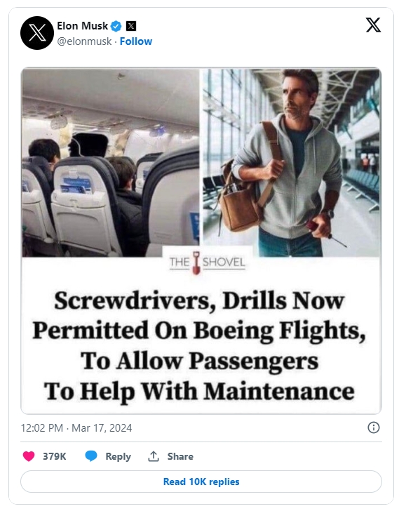 24일(이하 현지시각) 포춘에 따르면 머스크는 ‘언제 수리가 필요할지 알 수 없기 때문에 이젠 보잉 여객기에 스크류드라이버와 드릴을 갖고 탑승할 수 있게 됐다’는 내용의 밈(짤)을 자신이 총수로 있는 X에 지난 17일 올렸다.