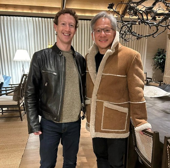 이미지 확대보기27일(현지시각) 마크 저커버그 CEO가 자신의 인스타그램 계정에 "Jersey swap.(유니폼 교환)"이라는 문구와 함께 저커버그와 젠슨 황이 함께 찍은 사진을 올렸다. 저커버그는 황이 즐겨 입는 검정색 가죽 재킷을 입었으며 황은 저커버그가 자주 입는 갈색 무스탕 재킷을 걸친 모습을 확인할 수 있다.