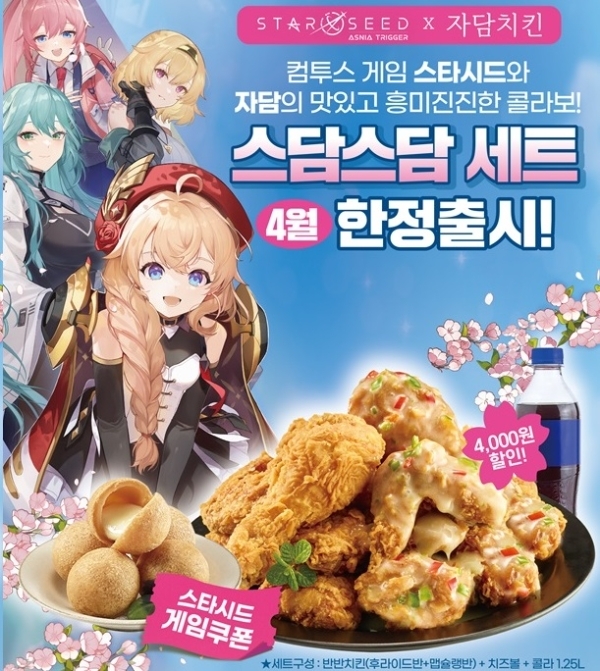 이미지 확대보기자담치킨에선 오는 30일까지 '스담스담 세트' 한정 판매에 나선다. 후라이드·맵슐랭 치킨 반반 1마리에 콜라, 치즈볼로 구성된 이 세트를 구매한 고객에겐 '스타시드'에 쓸 수 있는 인게임 쿠폰이 함께 증정된다.