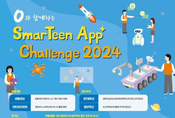 이미지 확대보기2011년부터 시작한 '스마틴앱챌린지'는 ICT 분야의 창의적 아이디어를 가진 우수 인재를 발굴, 육성해 창∙취업을 지원하는 프로그램이다. 전국 고교생 및 동등한 자격의 청소년이면 누구나 참가할 수 있으며 모집분야는 △생활정보(AI, IoT, 생활 분야 전반) △엔터테인먼트(게임 및 fun분야, AR·VR 활용)이다.
