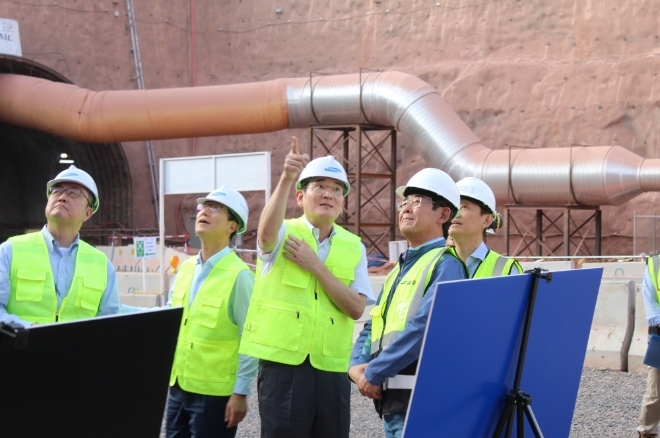 이재용 삼성전자 회장(가운데)이 지난해 10월 사우디아라비아 서북부 타북주(州)에서 삼성물산이 참여하는 '네옴(NEOM)' 신도시의 지하터널 공사 현장을 방문해 공사 상황을 점검하고 있다. 사진=삼성전자이미지 확대보기