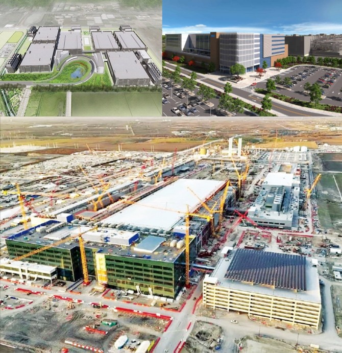 TSMC가 미국 애리조나 피닉스에 짓기로 한 팹 조감도, 인텔이 오하이오주에 건설하고 있는 팹 조감도, 삼성전자가 미국 텍사스주 테일러시에 짓고 있는 삼성 파운드리 공장(왼쪽 상단부터 시계방향으로). 사진=TSMC, 인텔, 테일러시