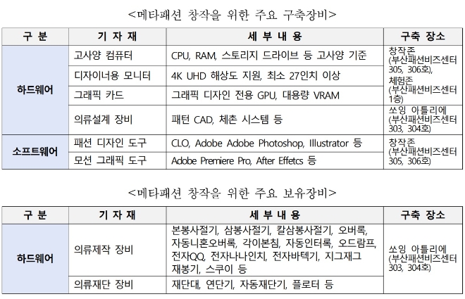 패션기술(테크)산업 육성을 위해 디지털 패션 체험 공간 및 체험 서비스를 제공하는 ‘가상 세계(메타) 패션 플레이그라운드’를 구축·운영하고 디지털 전환 촉진 및 보급 확산을 추진하는 기반을 마련한다. 이 사업을 통해 부산패션비즈센터를 대상으로 장비를 구축하고 실증 및 운영하게 된다.