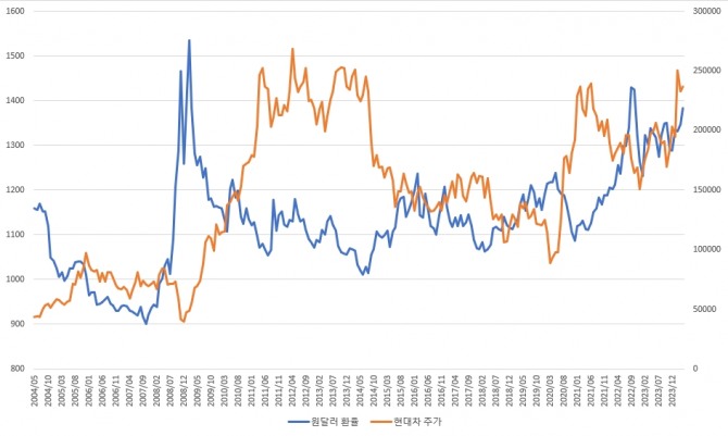 현대차와 기아 주가는 원·달러 환율과 반비례 관계를 보인다. 대표 수출업종인 만큼 원·달러 환율이 상승(달러 강세)할수록 달러 수입이 늘어난다. 따라서 원·달러 환율이 비교적 높은 상황에서 저점을 형성하고 하락 전환(원화 강세) 시 본격적으로 주가가 상승하는 경향을 보인다.