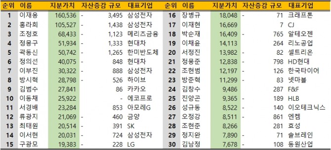 한편, 서정진 셀트리온 회장은 전일 19위에서 20위로 한단계 하락했다. 이채윤 리노공업 대표는 리노공업 주가 상승으로 19위로 한단계 상승했다.