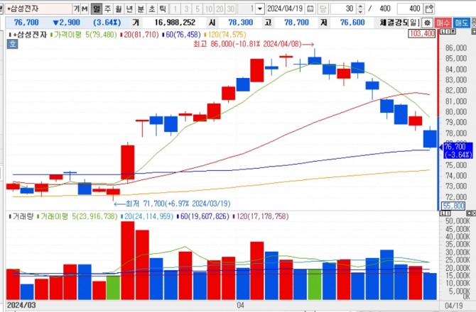 이미지 확대보기19일 한국거래소에 따르면, 이날 오전 11시 8분 현재 삼성전자는 전 거래일 보다 2800원(-3.52%) 내린 7만6800원에 거래되고 있다.