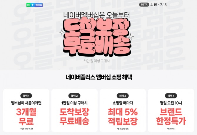 이 외에도 네이버플러스 멤버십 이용자를 대상으로 '네이버도착보장 무료배송'도 3개월 동안 제공한다. 5일부터 7월 15일까지 3개월 동안 모든 멤버십 이용자에게 배송비 3500원 할인 쿠폰을 매일 지급한다. 해당 할인 쿠폰은 '네이버 도착보장' 태그가 붙은 상품 1만원 이상 결제 시 사용할 수 있다.