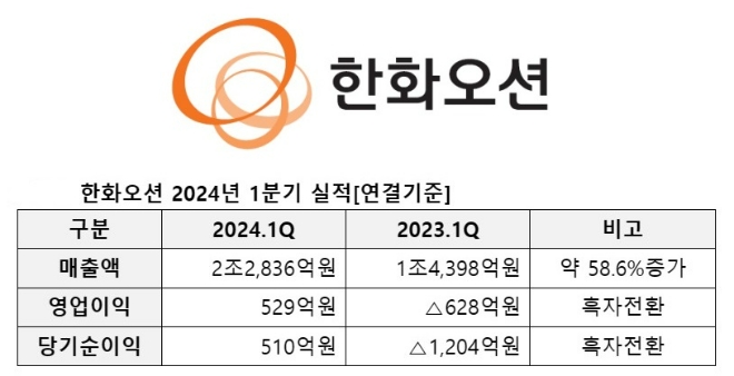 이미지 확대보기한화오션은 매출액 2조2836억원, 영업이익 529억원, 당기순이익 510억원 등 1분기 경영실적을 발표했다. 지난해 동기 대비 매출은 약 58.6% 증가했다. 영업이익과 당기순이익은 흑자 전환했다.