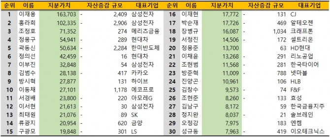 홍라희 전 삼성미술관 리움 관장 지분가치도 2906억원 축소된 10조2335억원으로 집계됐다. 삼성전자 의존도가 높은 만큼 타격이 더욱 클 수밖에 없었다.