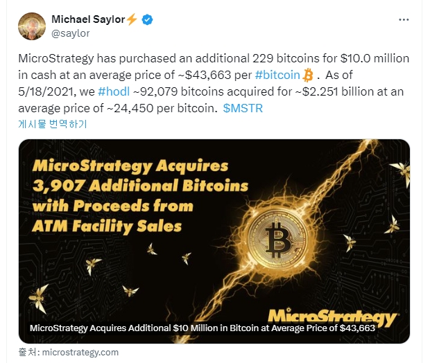 이미지 확대보기29일(현지시각) 마이클 세일러 마이크로스트래티지 회장은 자신의 X(옛 트위터)를 통해 "4월 마이크로스트래티지는 780만달러를 들여 122 비트코인을 추가로 매입, 현재 총 21만4400 비트코인을 보유하고 있다"고 전했다.
