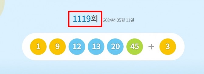 1119회 로또당첨번호(로또복권당첨번호) 조회 결과(추첨) 1, 9, 12, 13, 20, 45와 2등 보너스번호 3