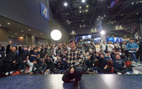 김형태 시프트업 대표가 2023년 12월 경기도 일산 킨텍스에서 열린 '애니메이션 게임 페스티벌'에 참여해 팬들과 함께 포즈를 취하고 있다. 사진=시프트업·레벨 인피니트
