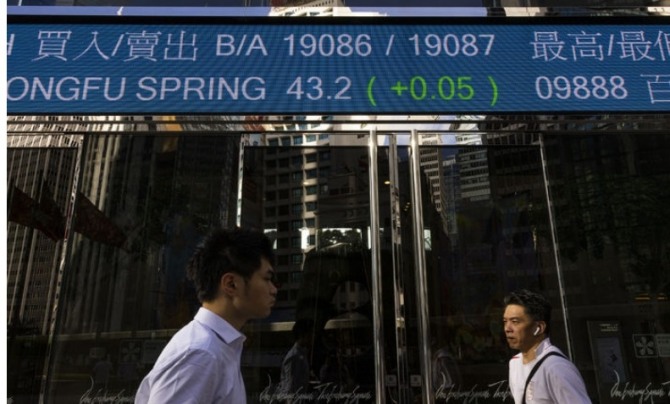 보행자들이 2023년 6월29일 홍콩 증권거래소 앞의 전자 스크린 시세판 앞을 지나가고 있다.     사진=AP/뉴시스이미지 확대보기