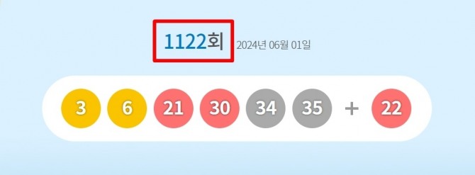 1122회 로또당첨번호(로또복권당첨번호) 조회 결과(추첨) 3, 6, 21, 30, 34, 35와 2등 보너스번호 22