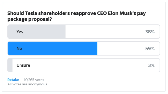 야후파이낸스에 따르면 자사 홈페이지에 들어온 네티즌 1만여 명을 대상으로 이번 연례 주총에서 테슬라 주주들이 머스크에 대한 성과급 지급안을 지난 2018년과 같은 내용으로 가결시켜야 하는지 부결시켜야 하는지를 물은 결과 이날 현재 응답자의 59%가 ‘부결시켜야 한다’고 답했다.