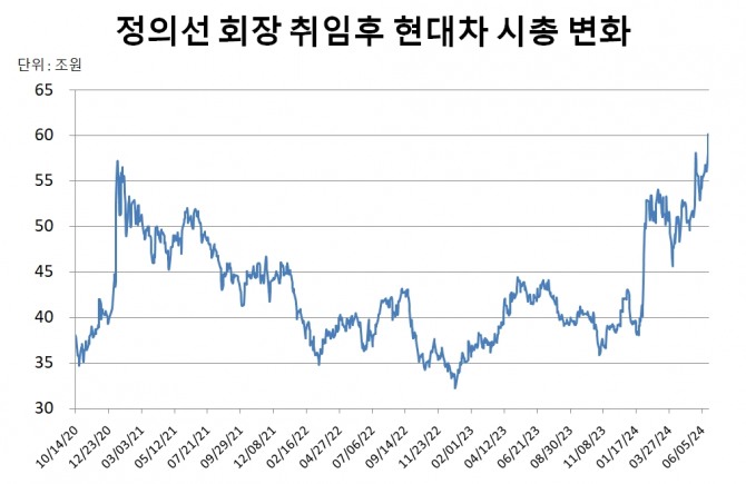 지난 2010년 10월 정 회장 취임 당시 시총을 살펴보면, 현대차는 38조원, 기아는 약 20조원으로 합산 기준 58조원 규모였다.