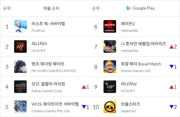 앱 통계 분석 플랫폼 모바일인덱스에 의하면 '라스트 워'와 '리니지M', '명조'는 6월 13일부터 22일까지 약 열흘 동안 매출 1, 2, 3위 자리를 지키고 있다. 4위 '오딘: 발할라 라이징'과 5위 센추리 게임즈 'WOS: 화이트아웃 서바이벌' 또한 같은 시기 톱5를 꾸준히 키지고 있다.