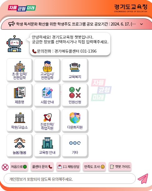 또 챗봇 사용에 대한 만족도를 평가하고 의견을 제출할 수 있다. 도교육청은 답변 내용을 수시로 확인하고 보강할 예정이며, 향후 지속적인 자료 관리를 통해 챗봇의 민원 상담 능력을 향상할 계획이다.